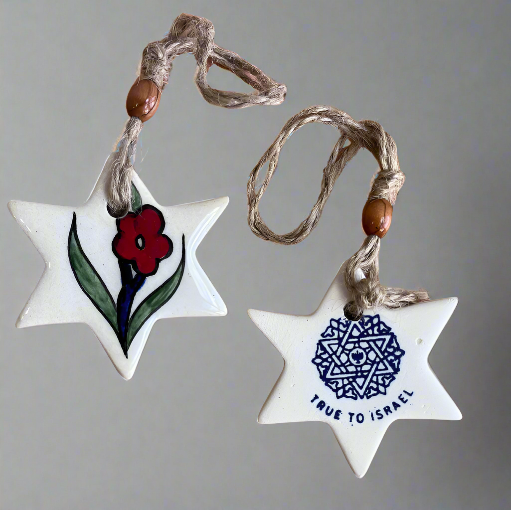 This handcrafted star-shaped ceramic ornament, decorated with a beautiful red flower, is a stunning piece of art from Israel. It features the True to Israel stamp on the back, ensuring its authenticity and connection to the Holy Land. Ideal for hanging in a window or on a Christmas tree, it adds a touch of beauty and meaning to any space.