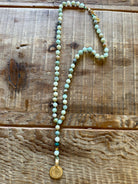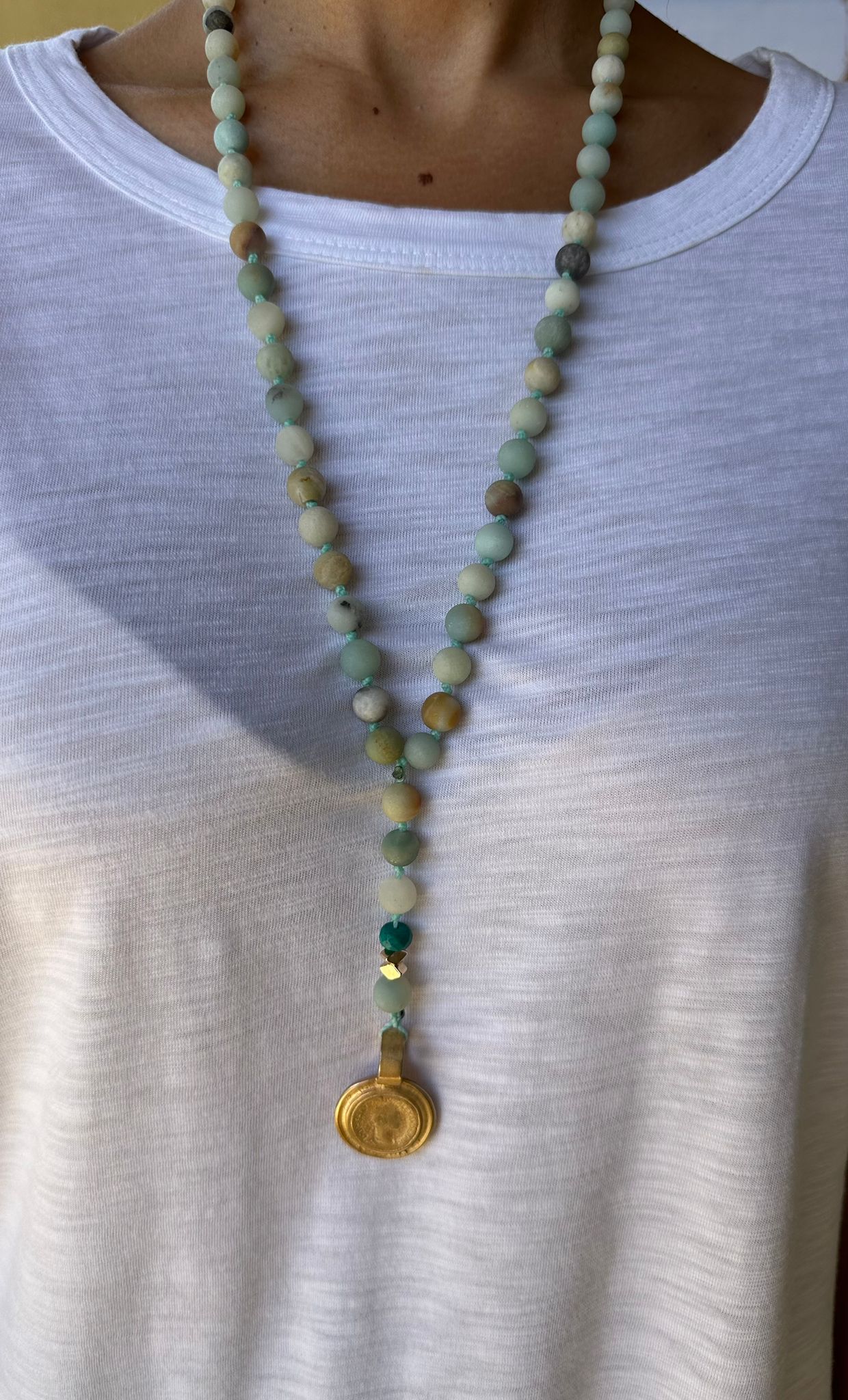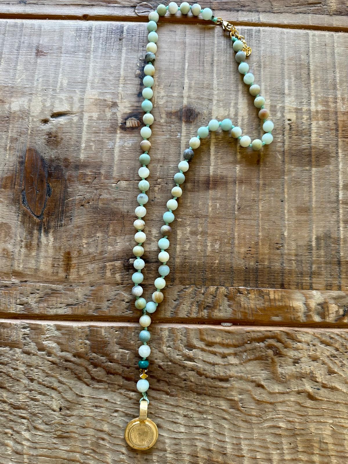 Sand finish green amazonite beads with a 24-karat gold pendant. Make sure to add this unique necklace from Israel to your collection and support the artisans who crafted it.
