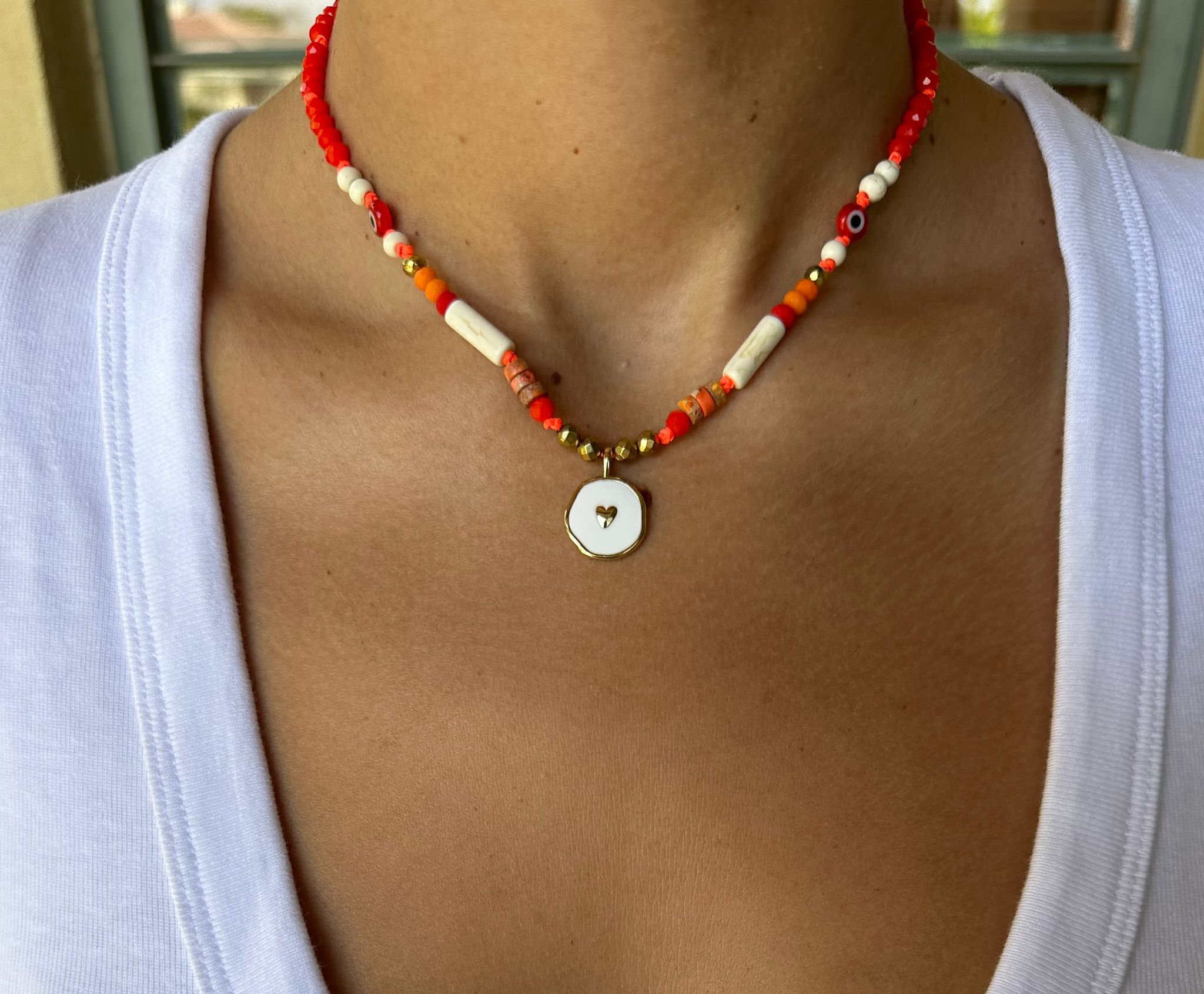 このネックレスは手作りの逸品で、繊細な赤と白のビーズで飾られた美しいハートのペンダントが特徴です。 2 つとして同じものはないため、それぞれが本当にユニークです。 ハートのペンダントと赤と白のビーズの組み合わせが、エレガントで独特なデザインを生み出しています。