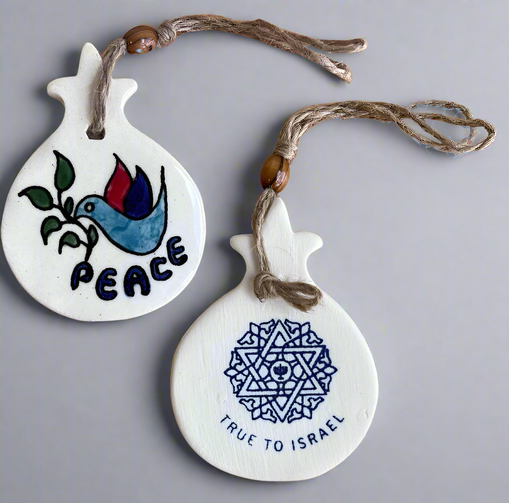 This hand-painted ceramic pomegranate is a symbol of peace and abundance. Beautifully crafted in Israel and stamped with the “True to Israel” mark on the back, it’s perfect for hanging in a window, on a Christmas tree, or anywhere in your home. A unique piece of Israeli art that carries timeless meaning.